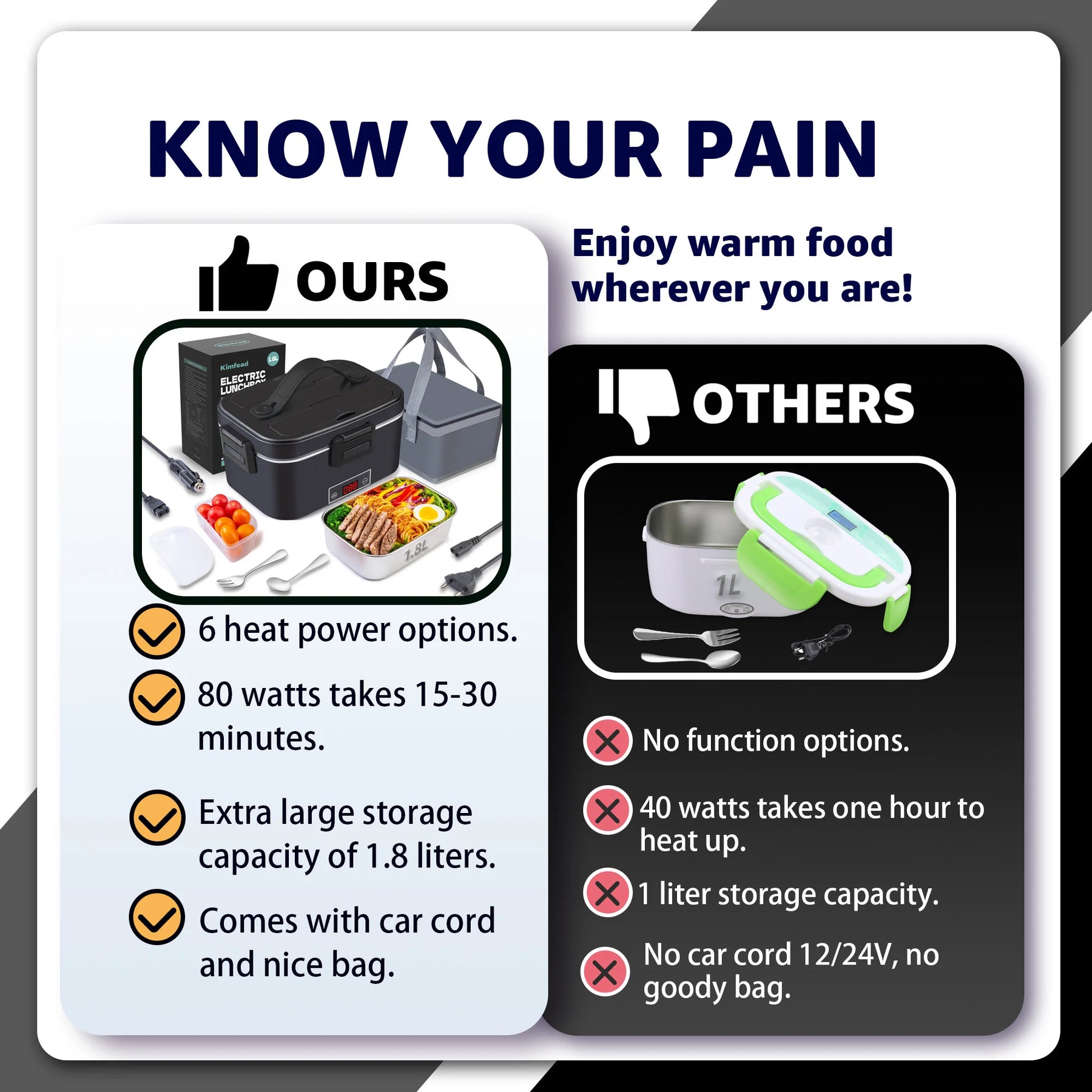 80W Fast Heating: More powerful than standard lunch boxes - heats your meal thoroughly and quickly